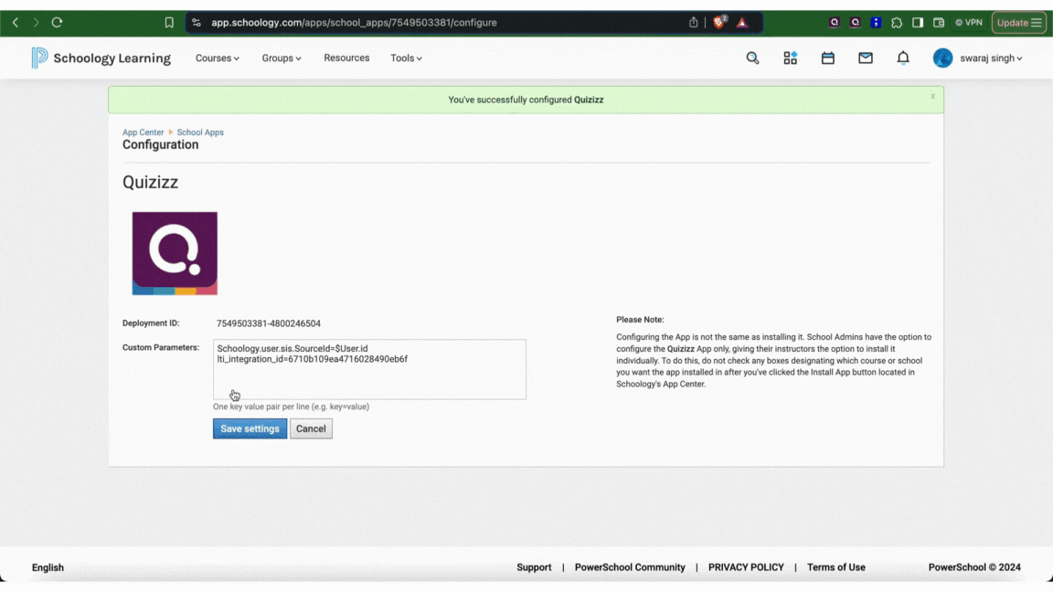 - Enter the Custom Parameters from the Schoology LTI integration page on Wayground
