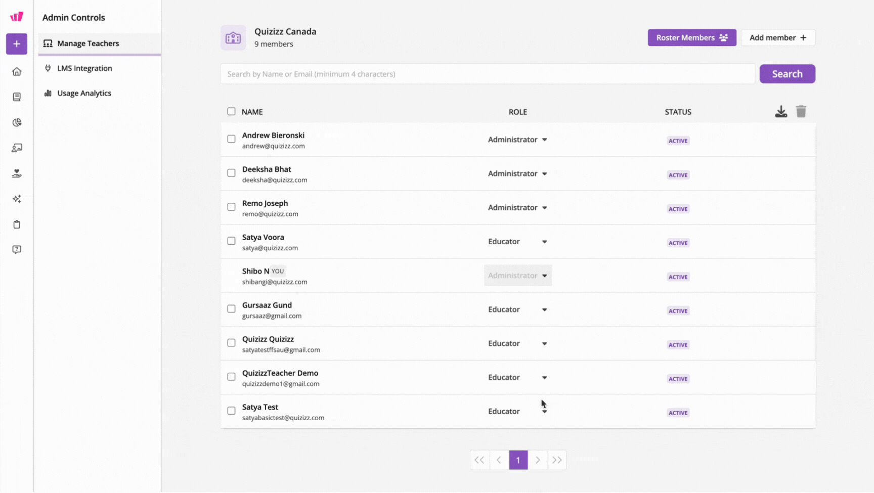 Users with administrator accounts can add and remove teachers from the organization's members list. They can also export or download the entire member list from this dashboard.