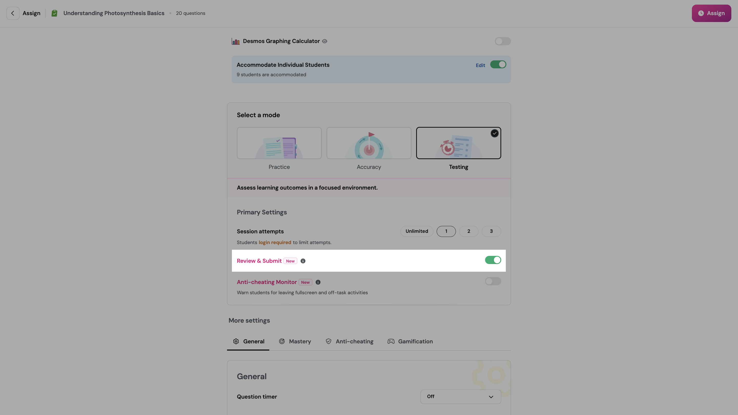 - Enabling Review & Submit will automatically disable Show Answers During Activity and Question Timer