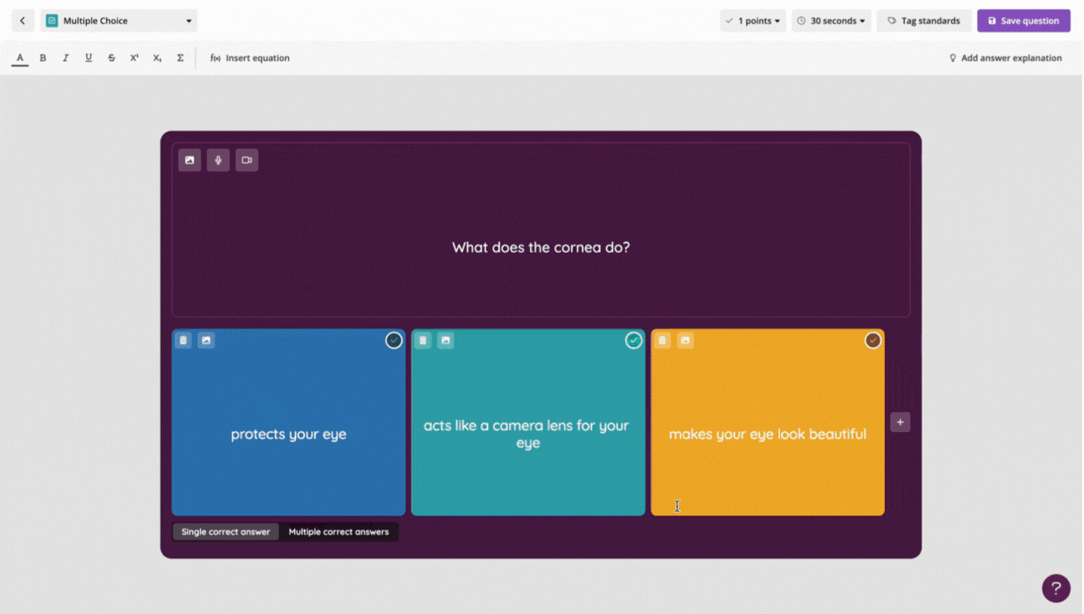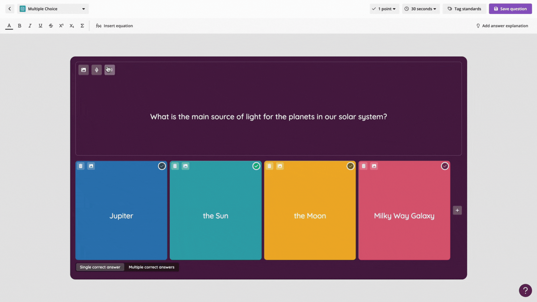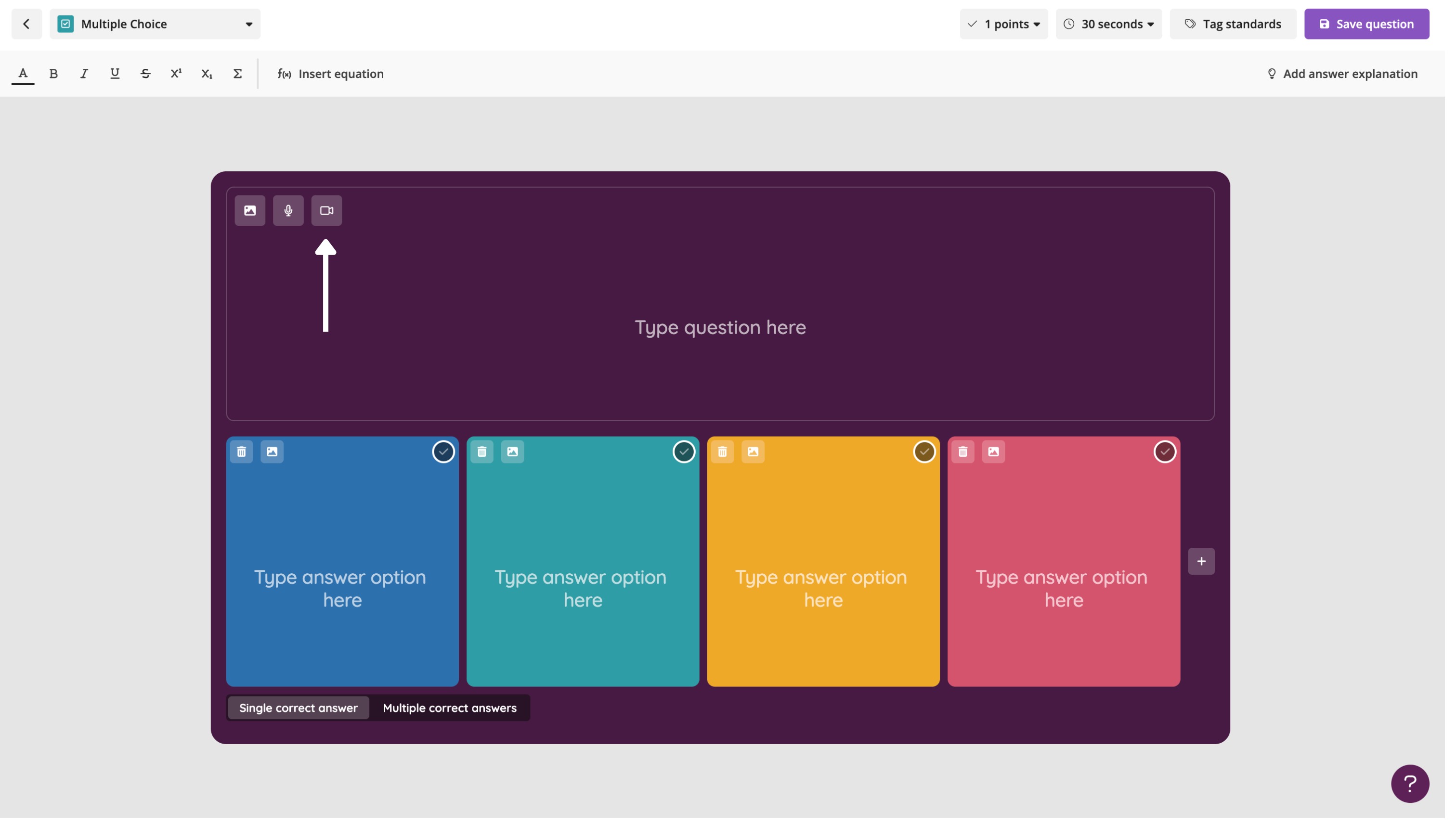 In the question editor page, you can add any video from YouTube, Google Drive, OneDrive, or your device to a question.