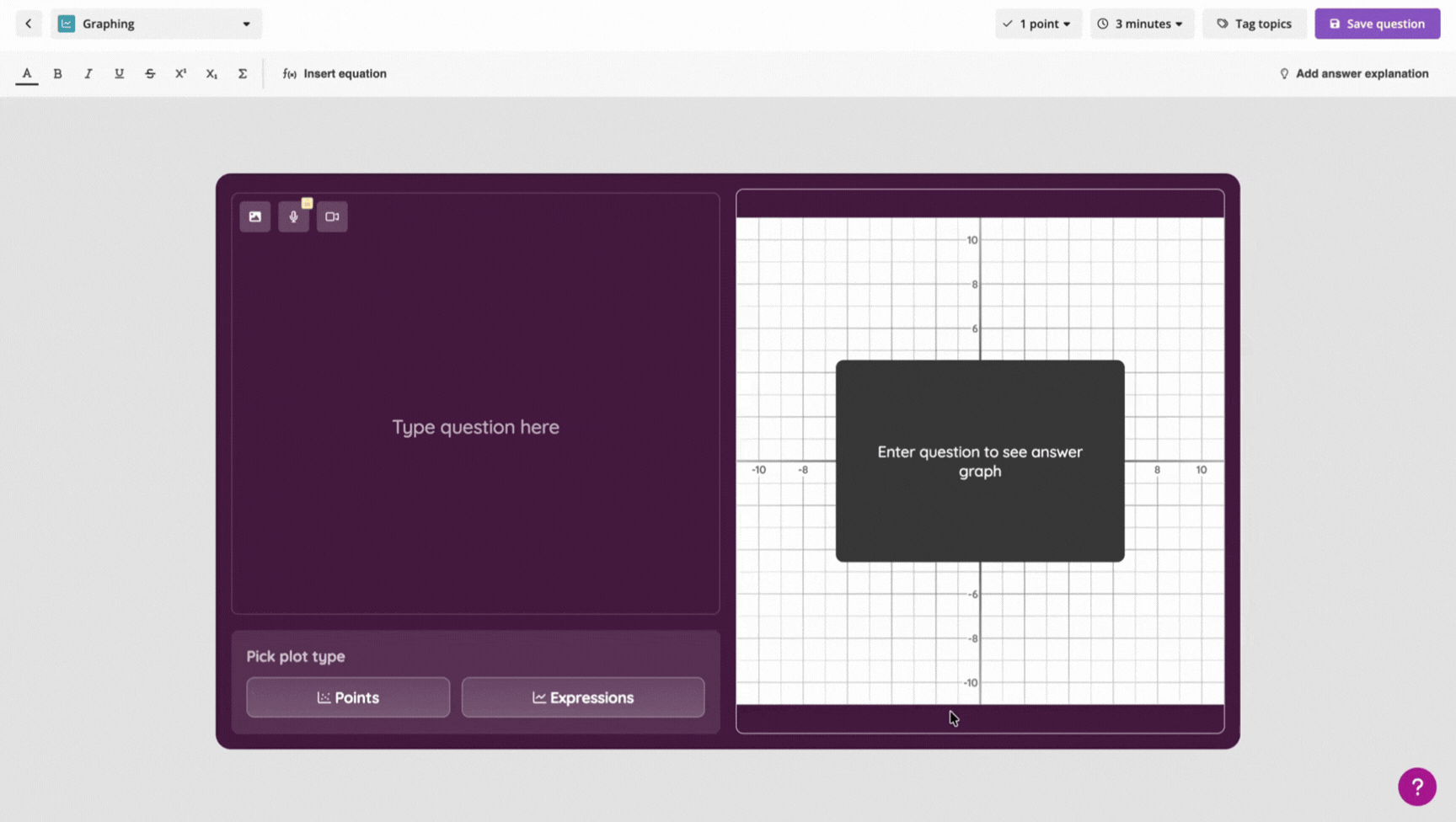 The Graphing question type lets you create auto-graded questions where students plot points, draw equations, or now select solution regions for inequalities directly on a graph. It is ideal for Math and Physics classes that focus on visual reasoning.