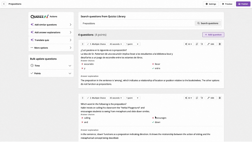 Click on the drop-down arrow next to 'Time', and choose the desired time duration for all the questions. Once you're done, click on 'Publish.'