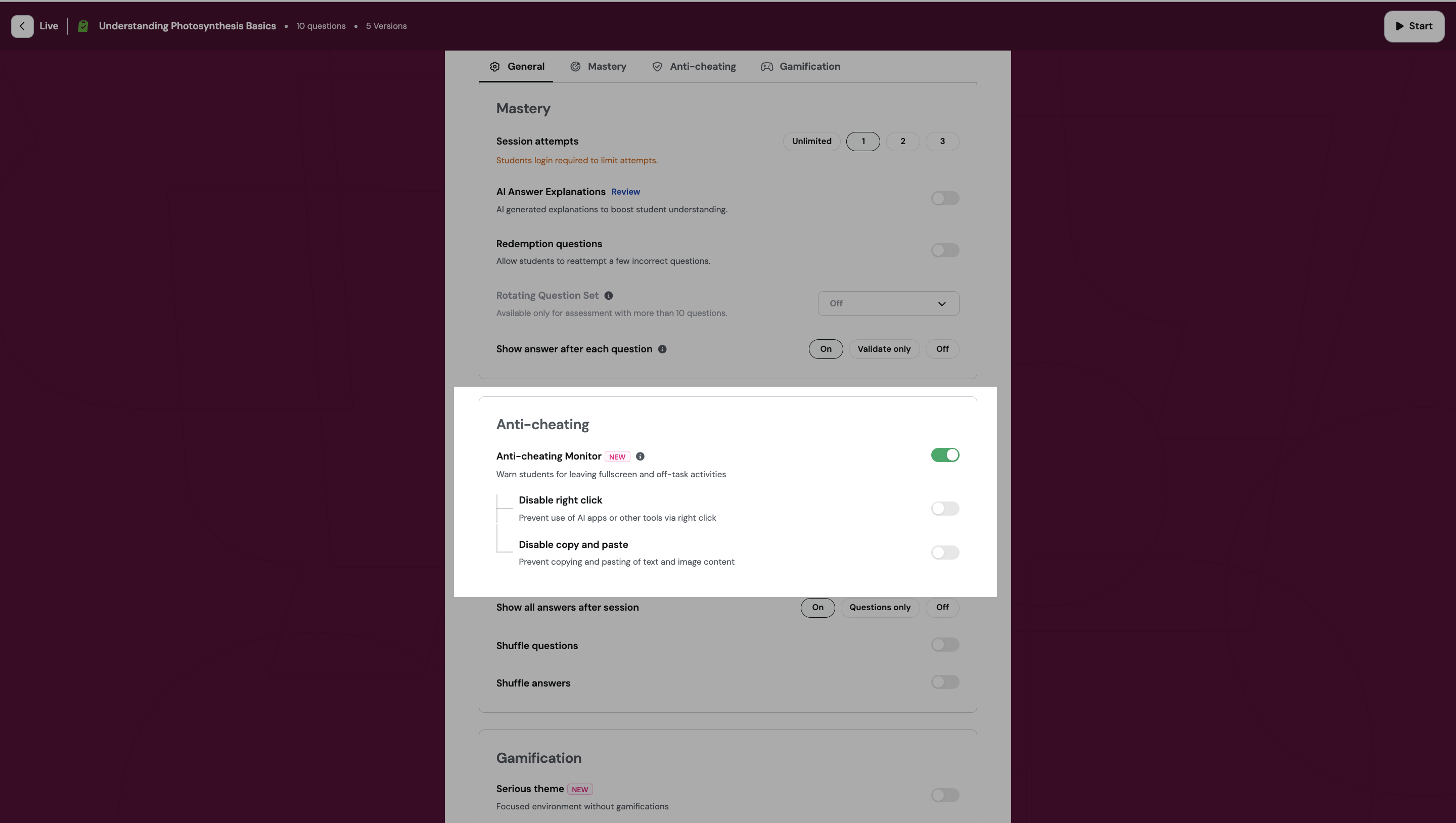 - Toggle on the 'Anti-Cheating Monitor' setting. This will activate the Anti-Cheating monitor for the session, and students will receive warnings whenever any of the above-mentioned suspicious activities are detected